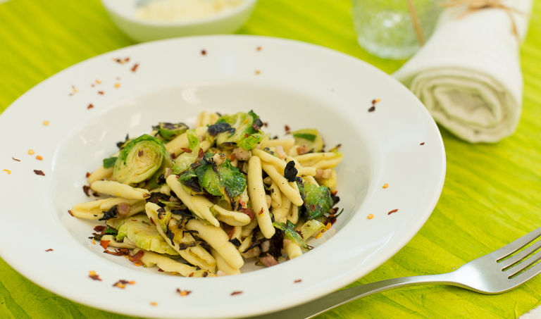 Trader Joe's Pesto Gouda Carbonara We made this last week with some modifications, and we were all happy to eat leftovers for lunch most of the rest of the week. If you like to shop at Trader Joe's, their website has a ton of great recipes using their particular in-house products. We made ours with regular old parmesan cheese instead of their Pesto Gouda, but this was an overall good framework for trying a brussels sprout packed carbonara that wasn't too heavy for a sweaty summer weeknight.